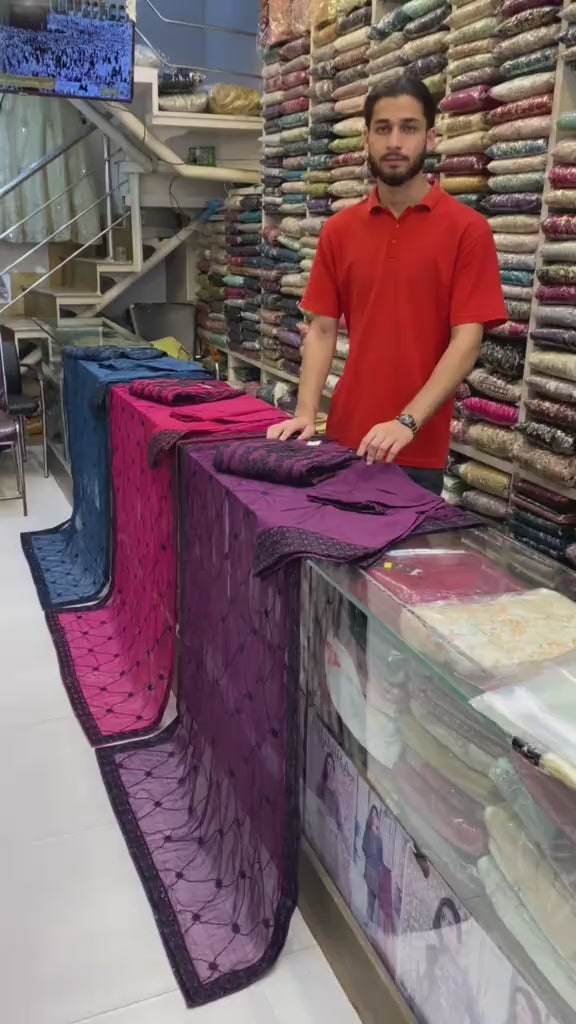 A stunning 3-piece suit crafted from premium fabric, adorned with intricate embroidery that exudes timeless grace.